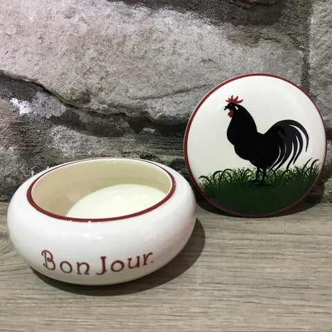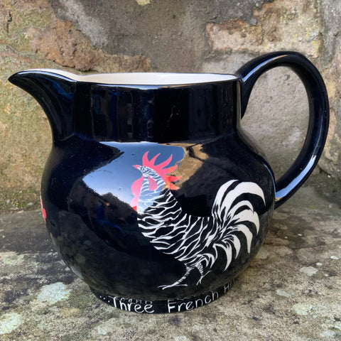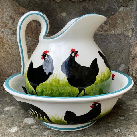 Cockerels, hens, pigs, cats, cows, sheep and dogs all appear in black silhouette on vibrant grass in this traditional design, which is derived from French pottery.