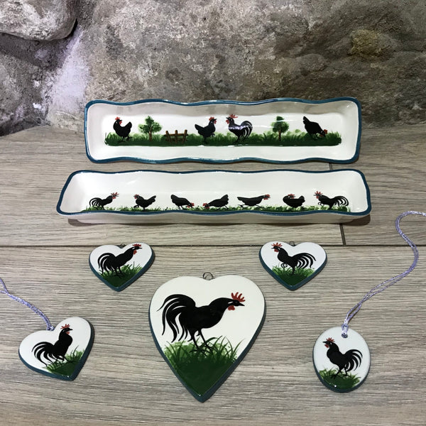 Cockerels, hens, pigs, cats, cows, sheep and dogs all appear in black silhouette on vibrant grass in this traditional design, which is derived from French pottery.