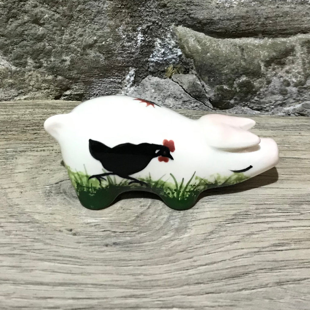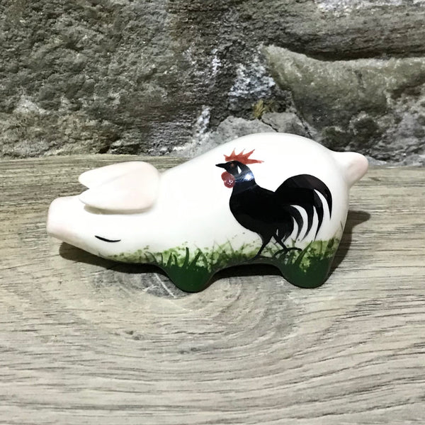 In Bohemia the pig is a symbol of good luck, and chocolate pigs are traditional New Year presents. It is believed that Karel Nekola brought his enthusiasm for pigs with him from his homeland, and persuaded his boss at the Fife Pottery to make them in several sizes. They were an immediate success, finding their way into many living rooms to enchant generations.