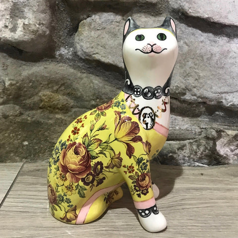 The Gallé design is named after the French designer Emile Gallé, who made pottery cats in his ceramics factory in Nancy from the late 1870s. It is thought that Robert Heron, the owner of Wemyss Ware®, was very impressed with the bold yellow cat with hearts and roundels which he saw in one of the Paris Great Exhibitions at the end of the nineteenth century. He bought one and decided to have a similar cat made in the Wemyss® way - similar but subtly different. The Gallé cat is one of our most popular designs.