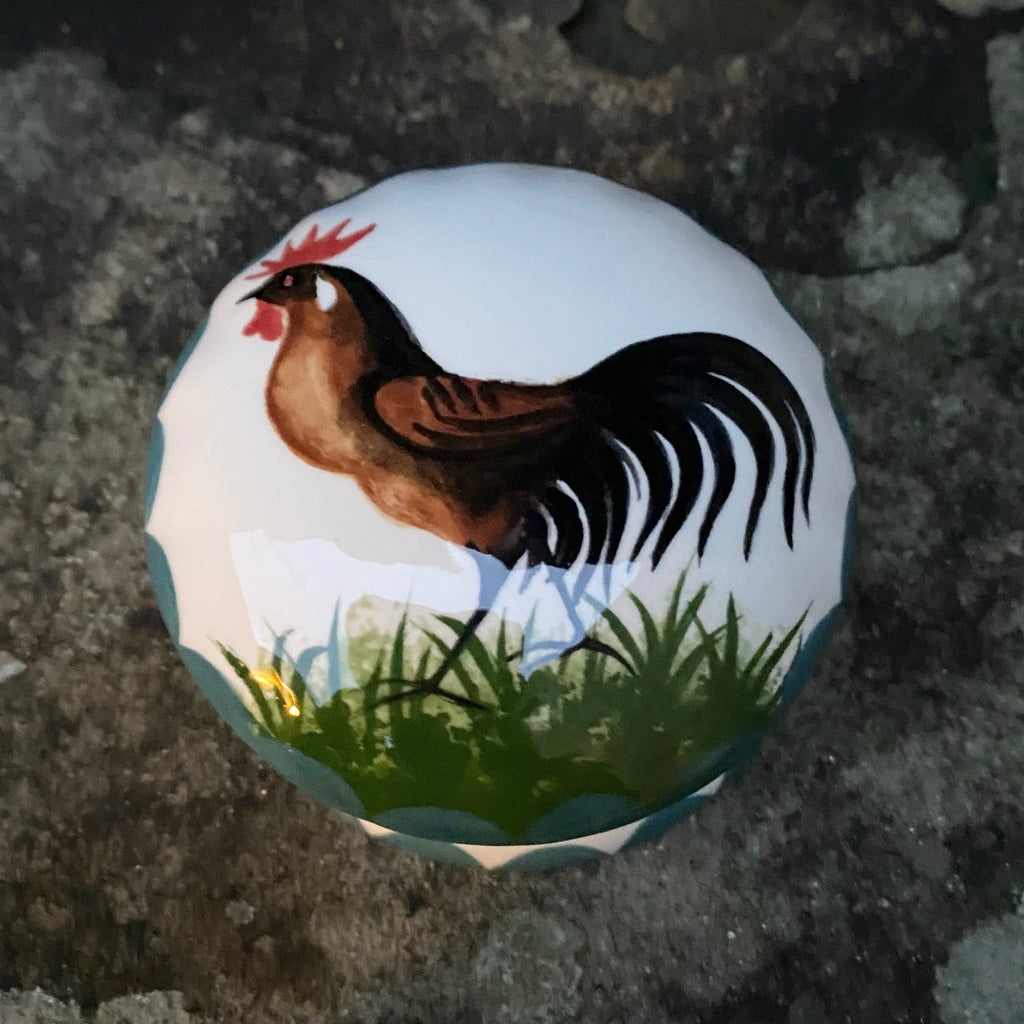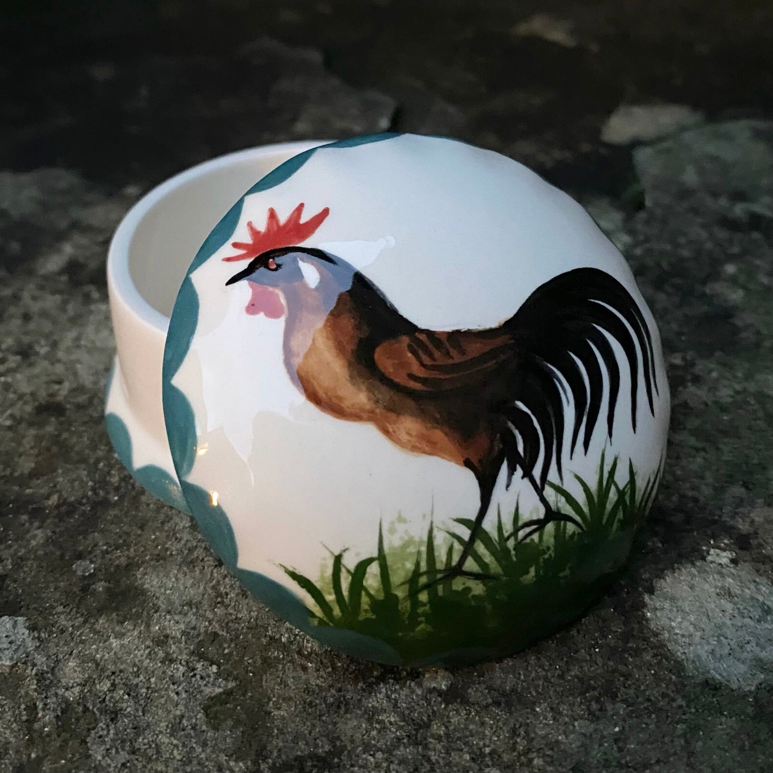 Cockerels on vibrant grass in this traditional design, which is derived from French pottery.