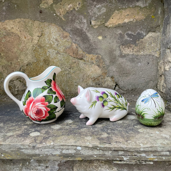 Each piece is hand painted by our talented Pottery Ladies and we can personalise any design, whether it is a wee bee to finish it off or some meaningful names, dates or sayings. Or how about your favourite flower or a beloved pet? We can even hand sculpt a mouse or butterfly onto a piece for you, the world is your oyster!