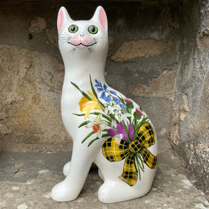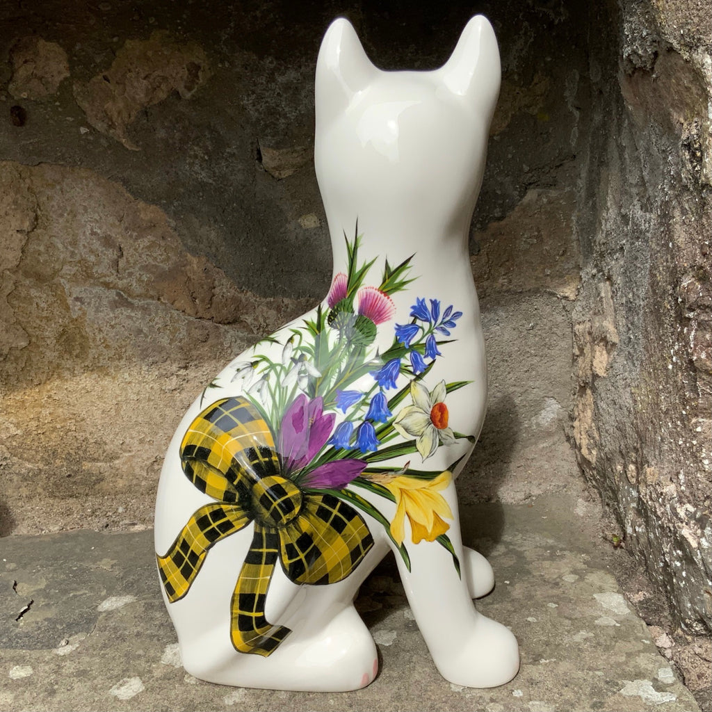 A commissionable magnificent Large Cat hand painted with your chosen family tartan which can also be decorated with flowers of your choosing. The tartan painted on the cat in the photo is of the Barclay clan!