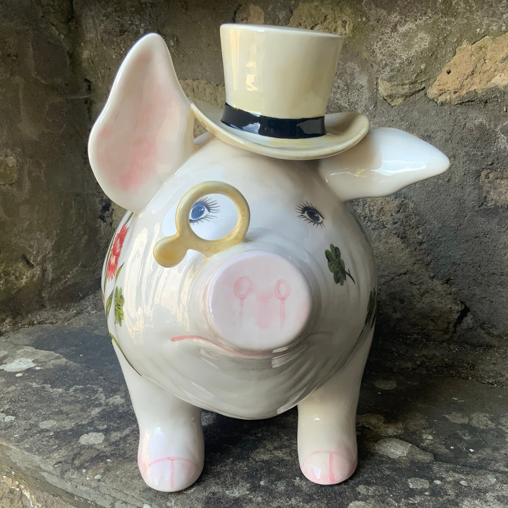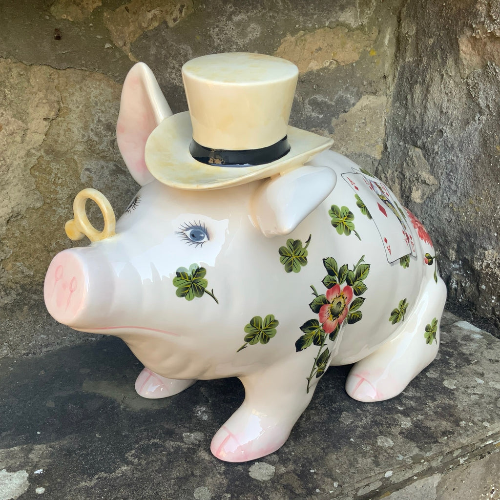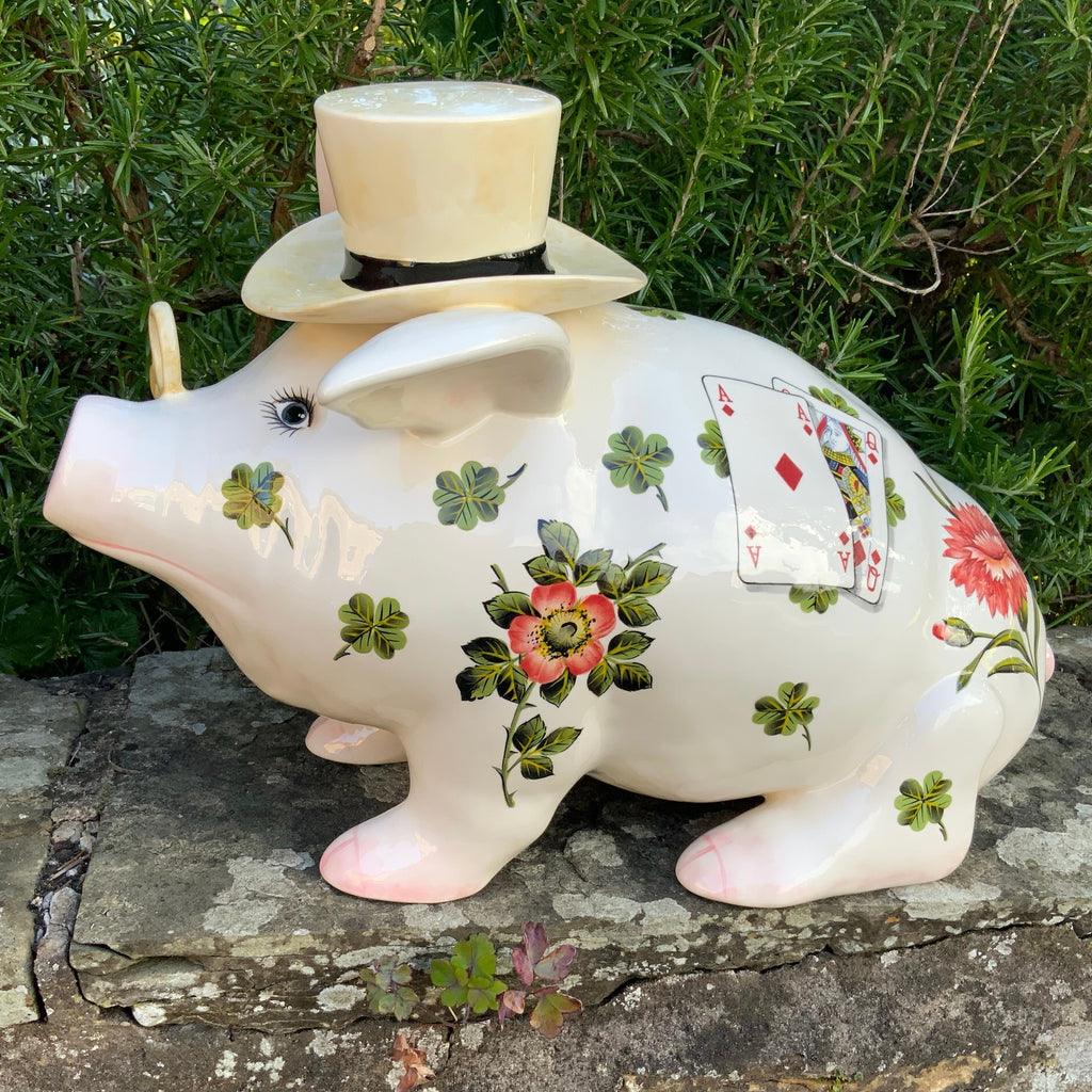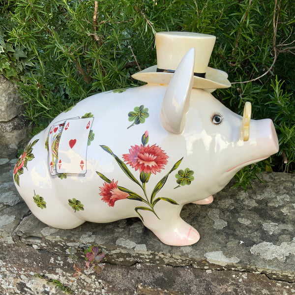 Large ‘Gambler’ Pig with Top Hat and Monocle, decorated with playing cards, four leafed shamrocks and various flowers